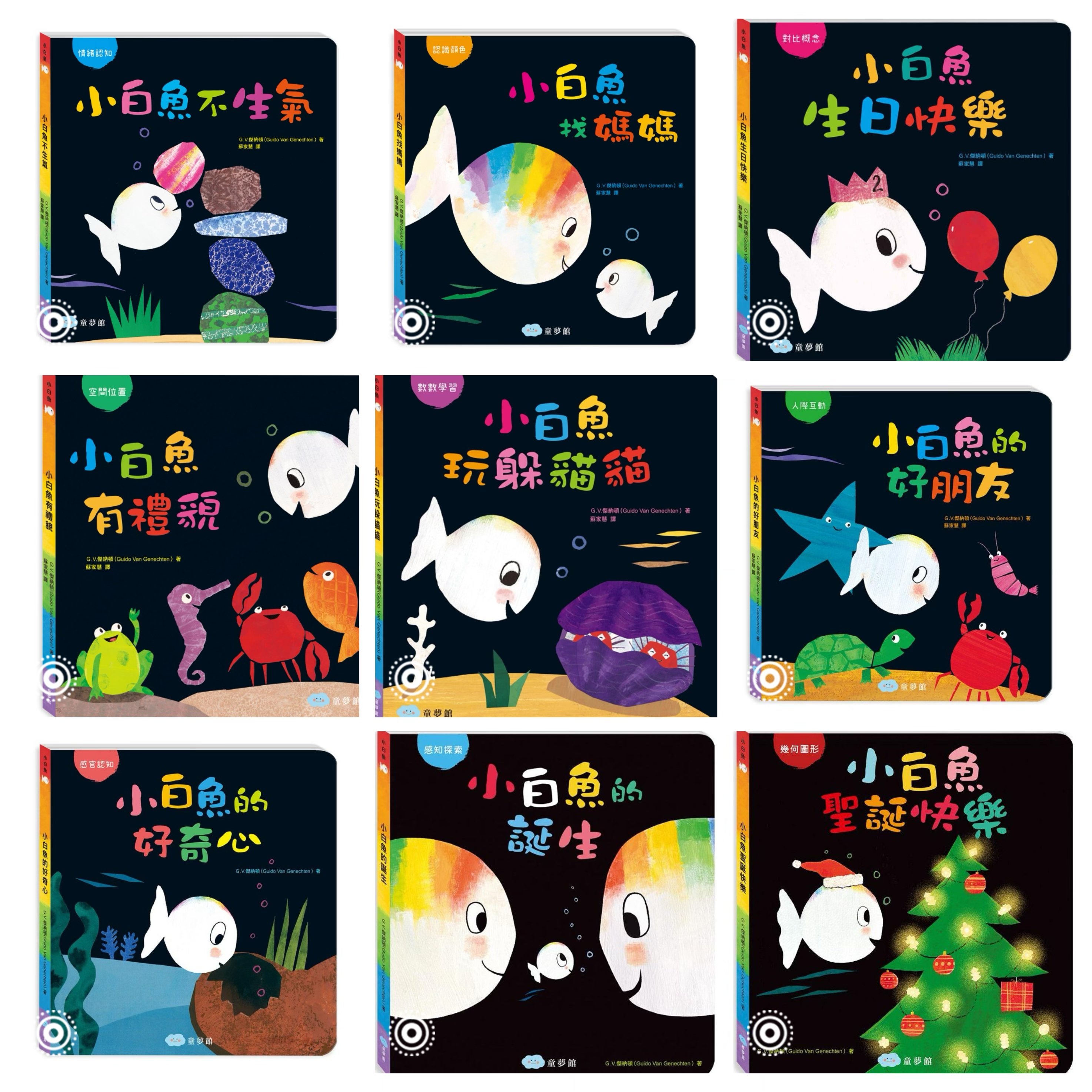 台灣直送✈️小白魚系列 超可愛簡易畫風的小白魚系列繪本,熱銷全球16個國家,人氣暢銷排行榜NO.1,新選擇:「圓角厚頁書」不易撕壞,圓角更安全。 🔺九大主題: 1. 小白魚找媽媽-認識顏色 2. 小白魚不生氣-情緒認知 3. 小白魚生日快樂 4. 小白魚有禮貌 5. 小白魚玩躲貓貓「厚頁書」 6. 小白魚的好朋友(人際互動) 7. 小白魚的好奇心(感觀認知) 8. 小白魚聖誕快樂(幾何圖形) 9. 小白魚的誕生(感知探索) ✅訓練小手肌肉發展:大小適中厚頁書,讓寶寶試著自己翻頁,讓小手更靈活。 ✅刺激視覺發展:以黑色為主,搭配小白魚的白色,強烈對比,吸引寶寶目光。 ✅啟蒙藝術美感:顏色多彩,可愛簡易畫風,豐富寶寶視覺感受。 ✅基本認知學習:每本主題不同,簡單到複雜漸進式引導孩子,認知生活知識。 ✅建立語言發展:語詞簡單,句型重複,提升基本語詞能力。 ✅親子共讀培養傾聽能力:藉由唸書給寶寶聽,培養親蜜感,讓寶寶更喜歡閱讀。 ✅培養閱讀好習慣:內文搭配注音,細膩插畫,不傷眼大字體,讓已學習注音的孩子,也可以自己輕鬆閱讀,建立閱讀習慣